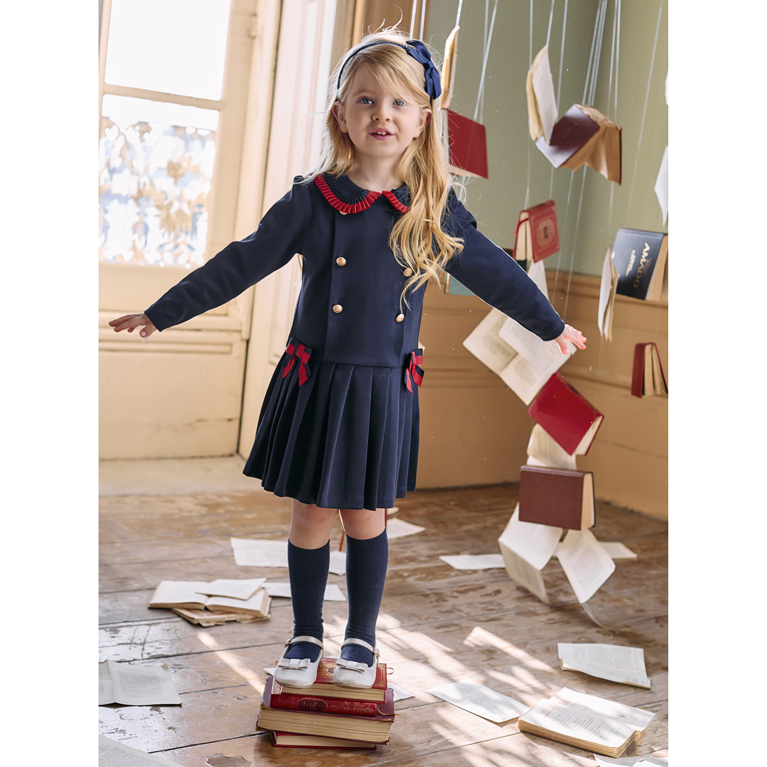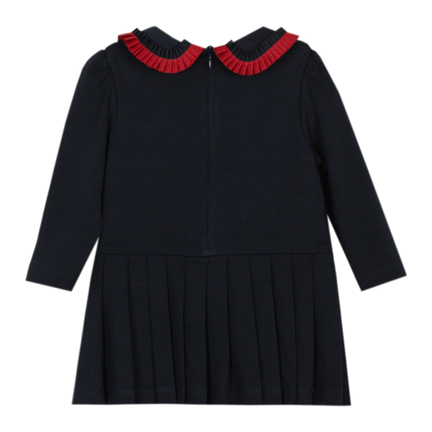 Patachou navy blue organic cotton dress featuring bow red pleated details and bows, plus pleated lower part.