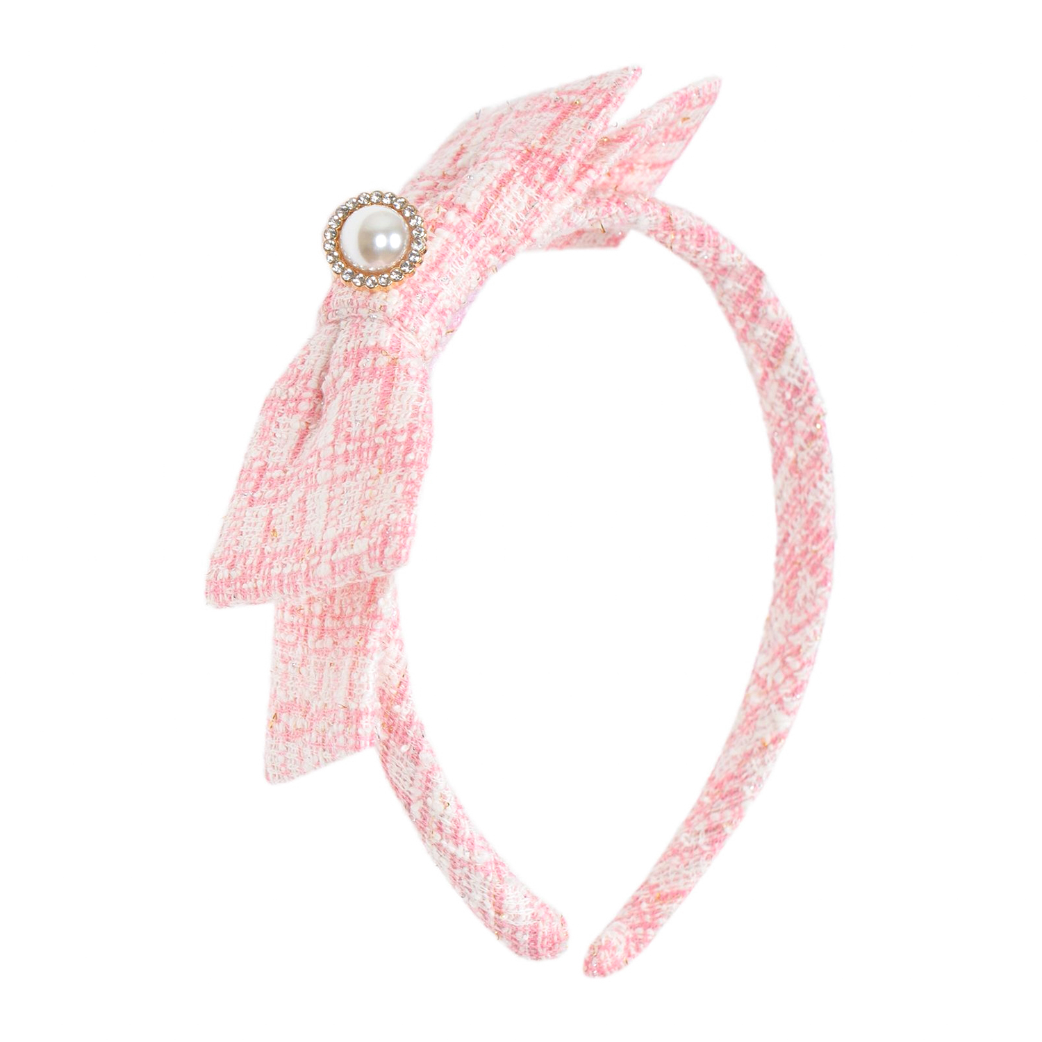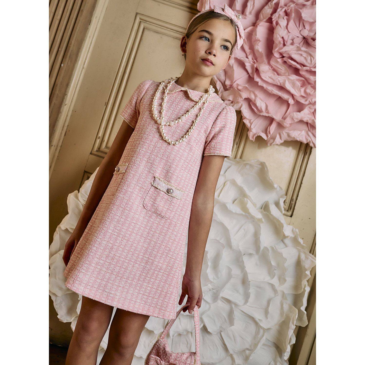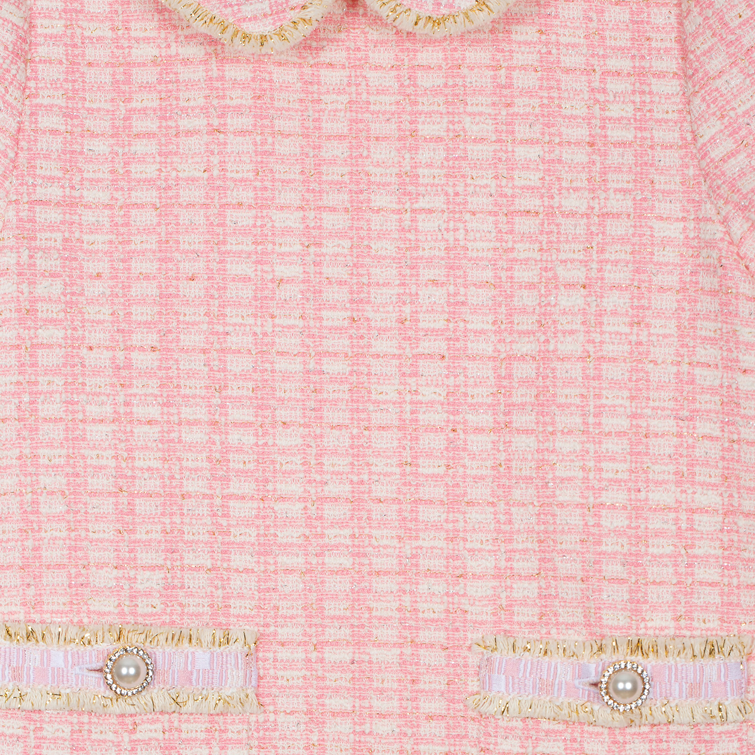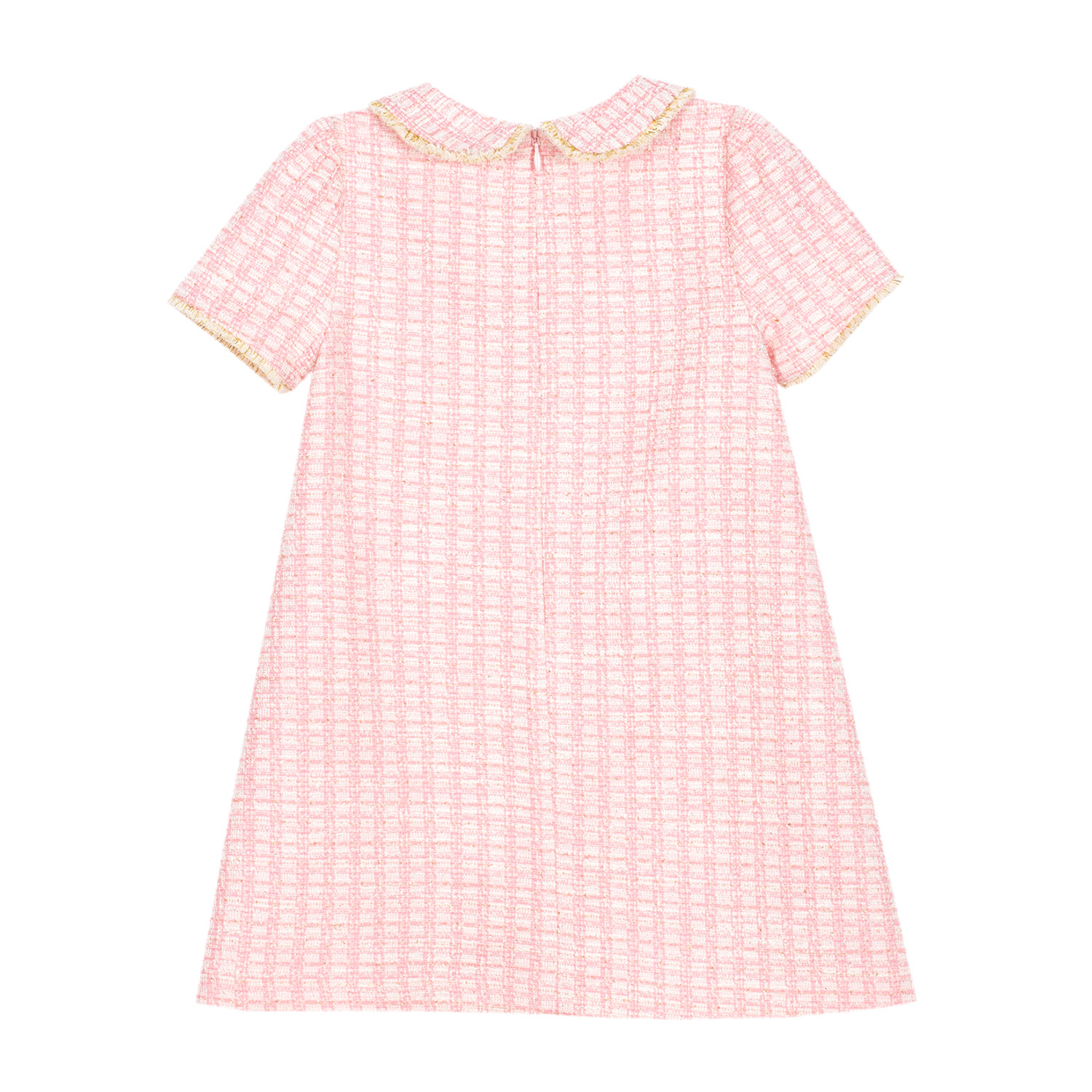 Patachou light pink tweed dress, featuring gold fringes and jewel-style buttons, a soft lining inside and a discreet zip fastening at the back.