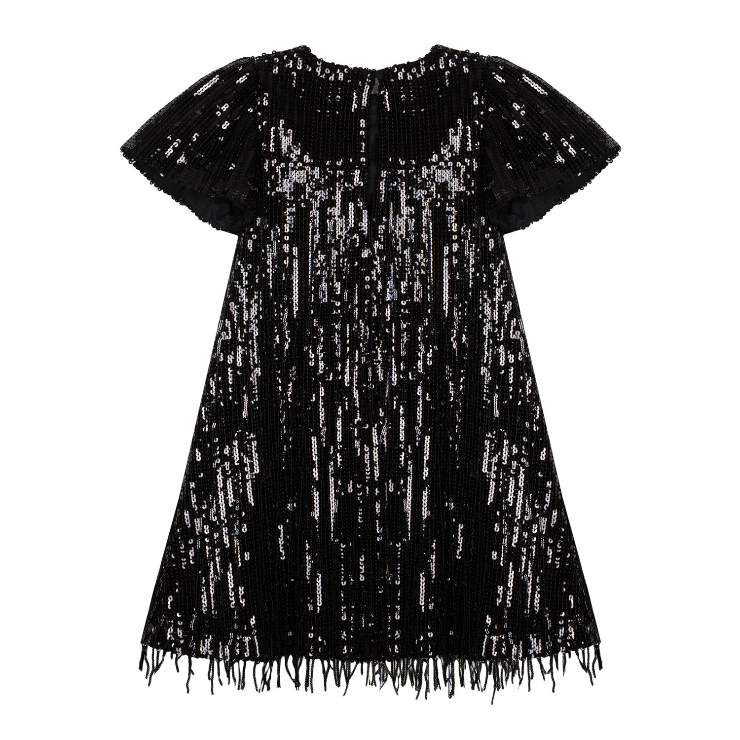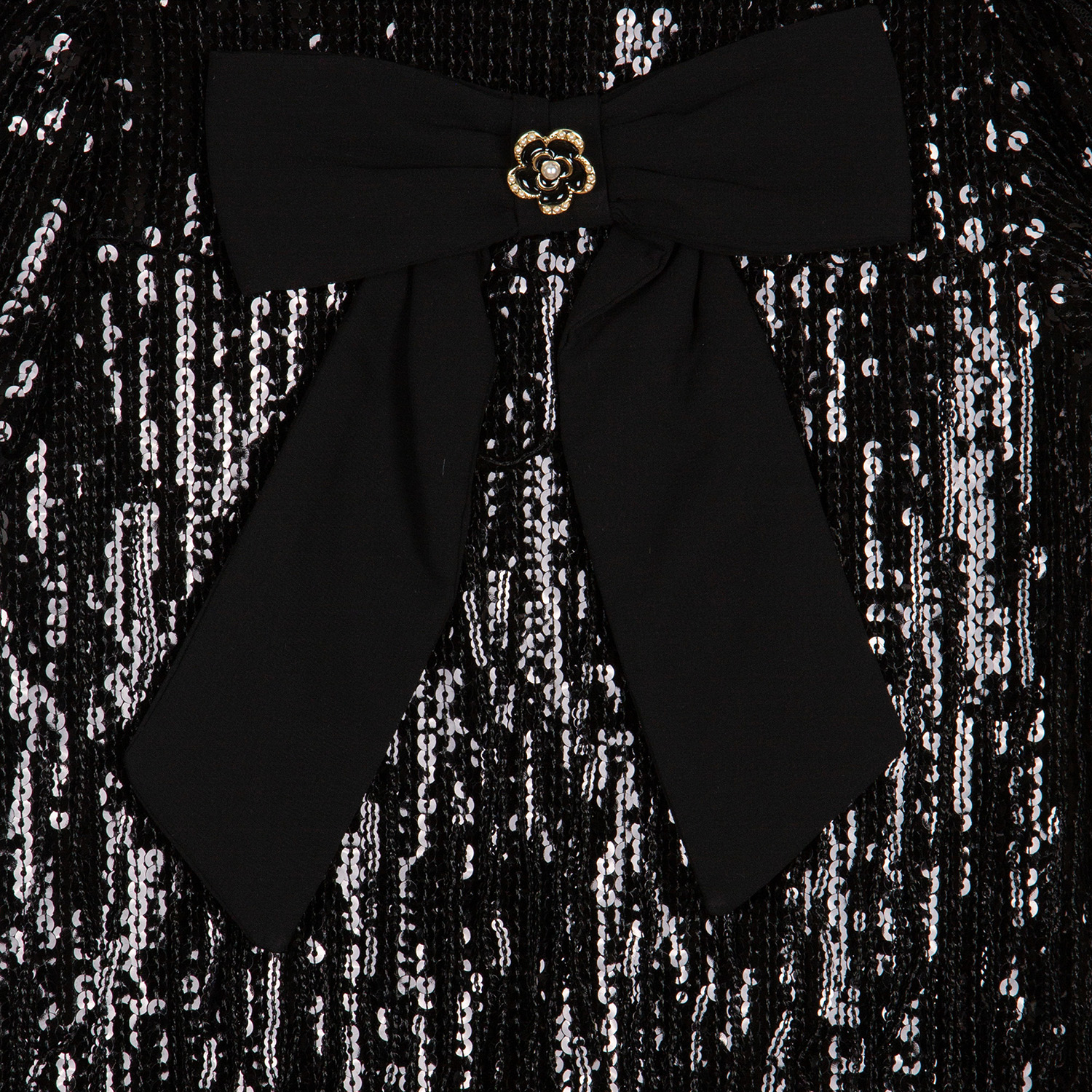 Patachou black sequin applique dress with fringed on the lower part, a crepe bow with jewel application and a soft lining inside.