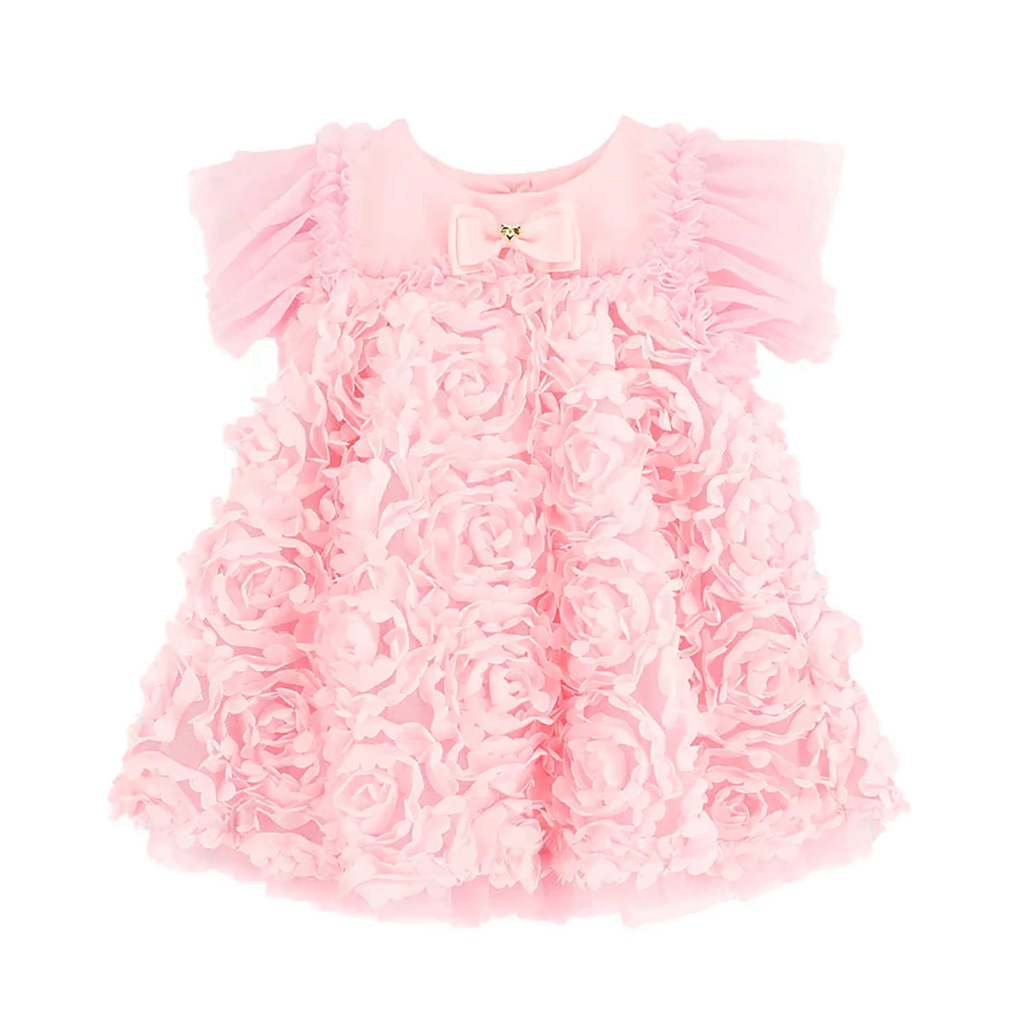 Angel s Face blush pink soft and elasticated dress, featuring 3D organza flower applications and soft tulle ruffled sleeves and underneath to add volume. It has rear button fastening and a soft lining inside.