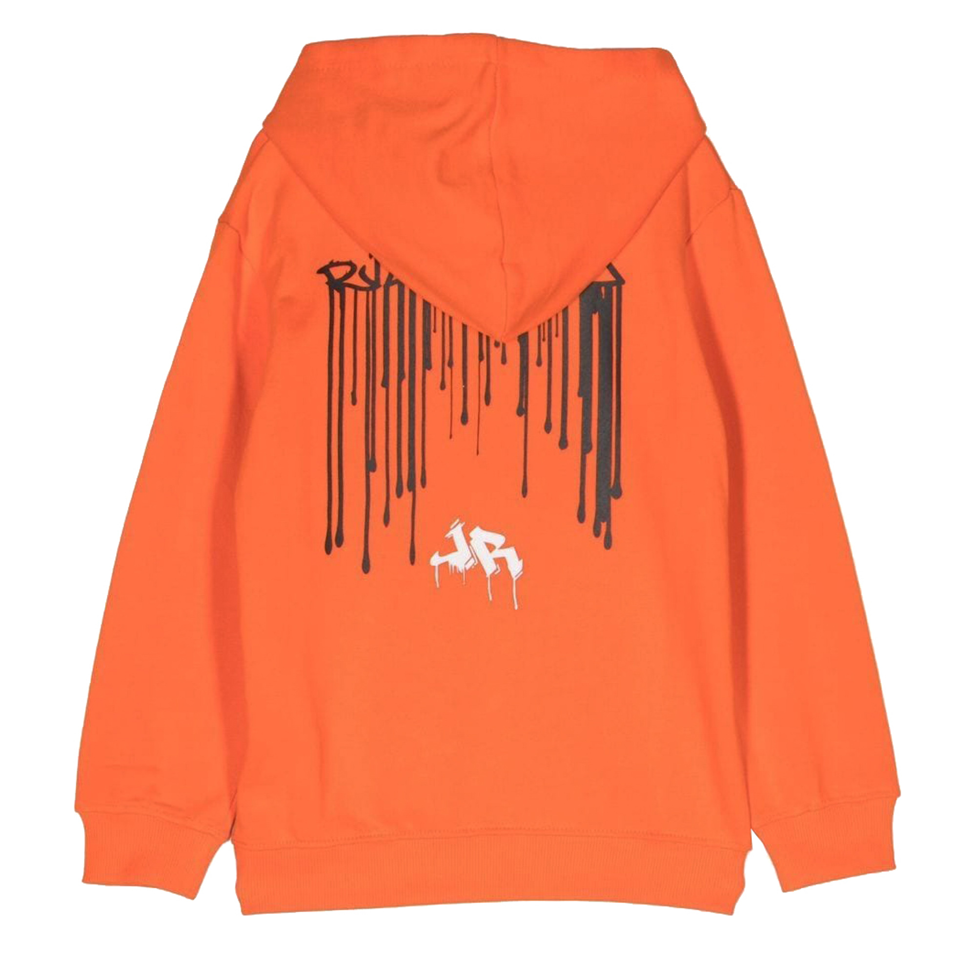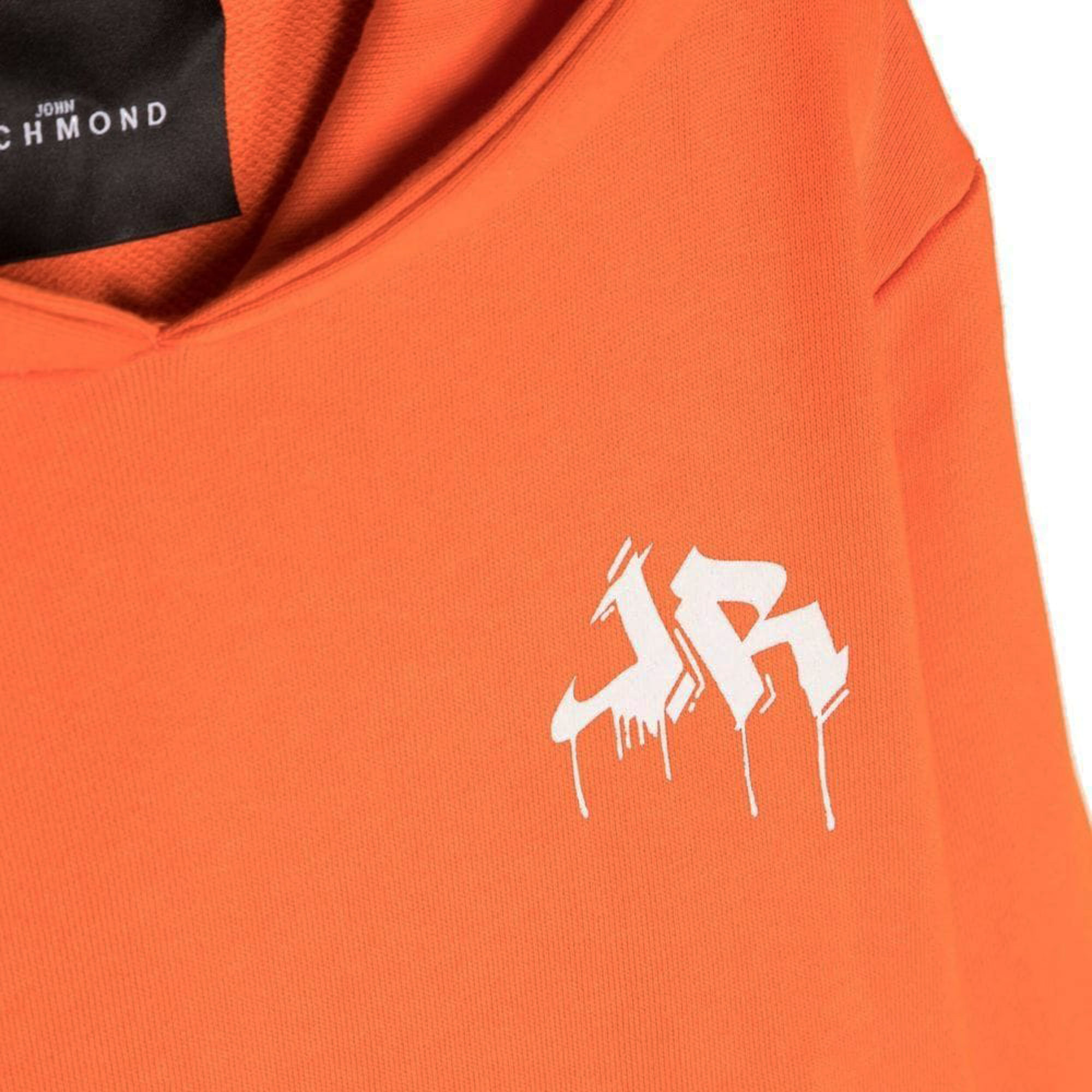 John Richmond orange cotton hoodie with central pocket and graffiti logo printed on the back.