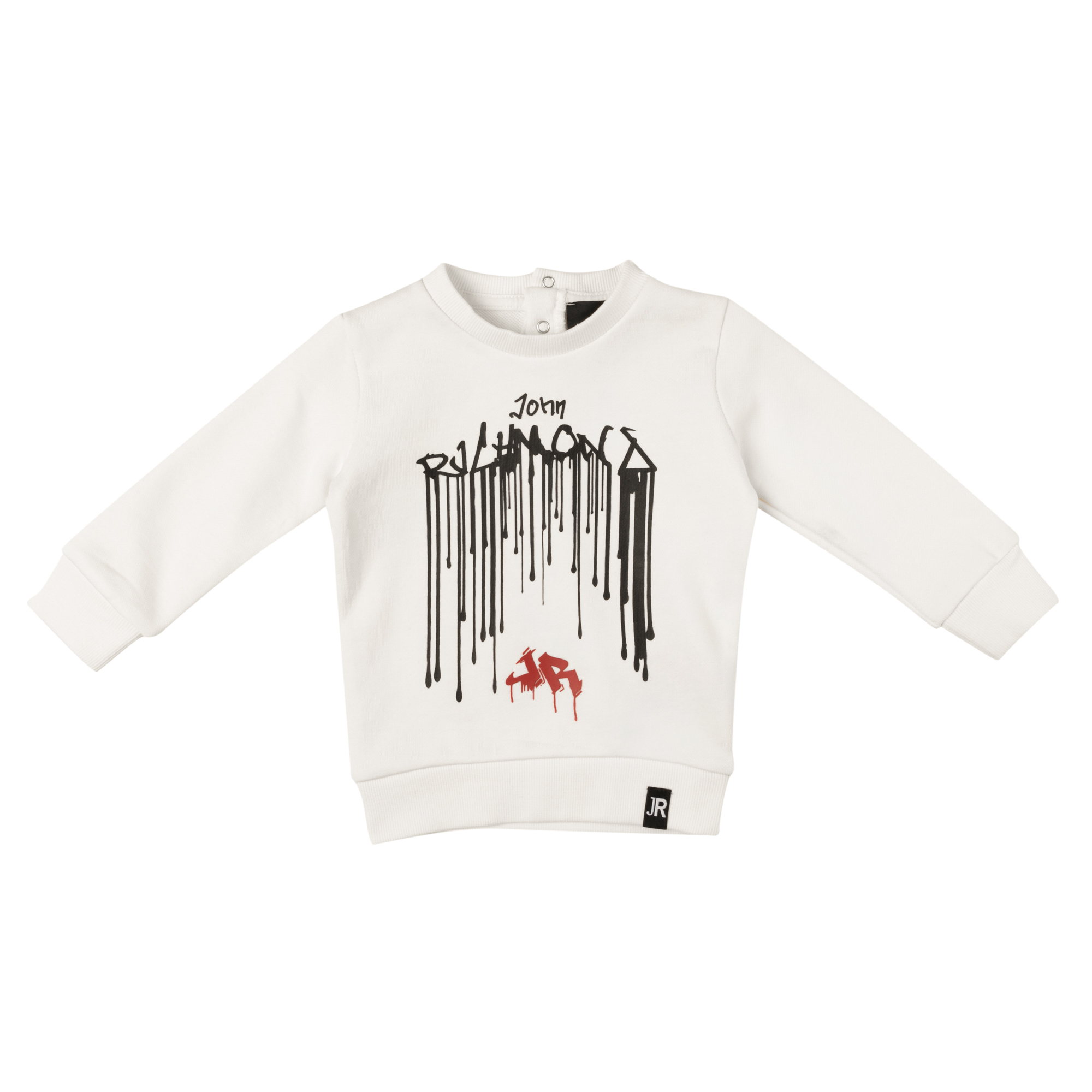 John Richmond off-white cotton sweatshirt with black graffiti style logo printed in front and popper buttons at the back.