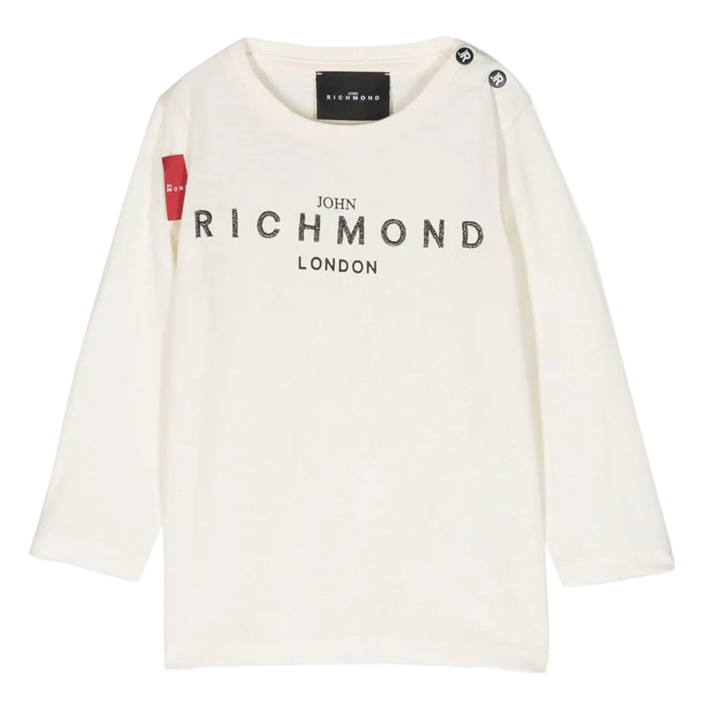 John Richmond off-white organic cotton t-shirt with black embroidered logo on the chest and popper buttons at the back.