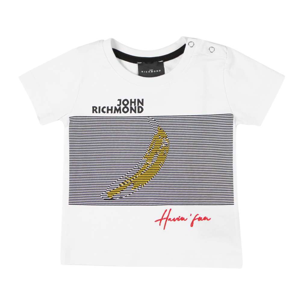 John Richmond white cotton t-shirt with striped design in front and a banana printed.