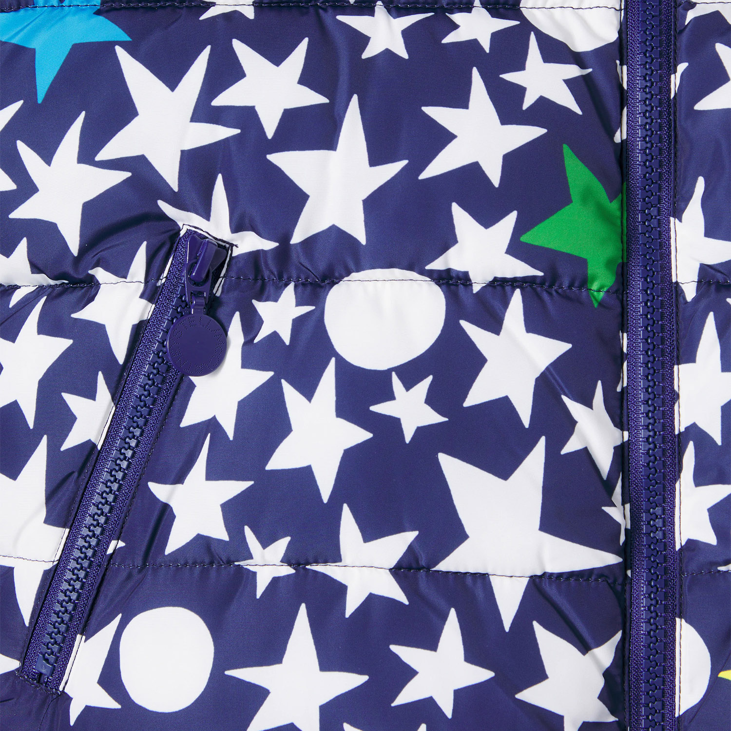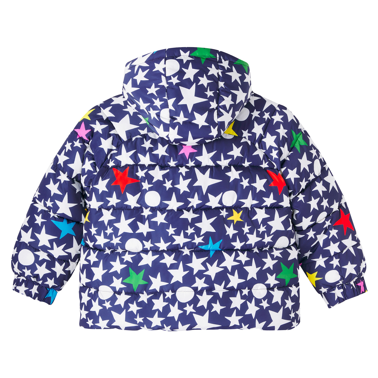 Stella McCartney blue royal puffer jacket featuring colorful star printed pattern. It features a hood and elasticated waistband and cuffs.