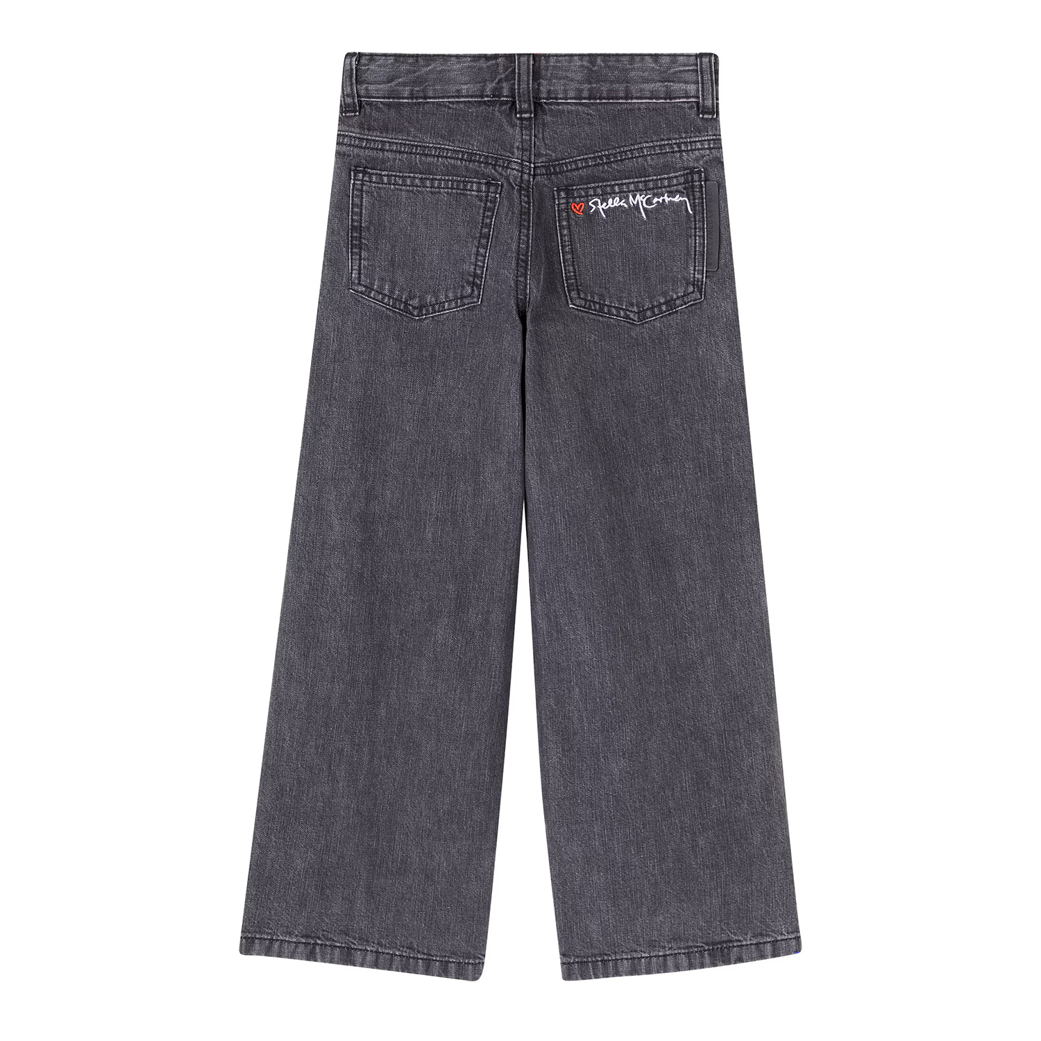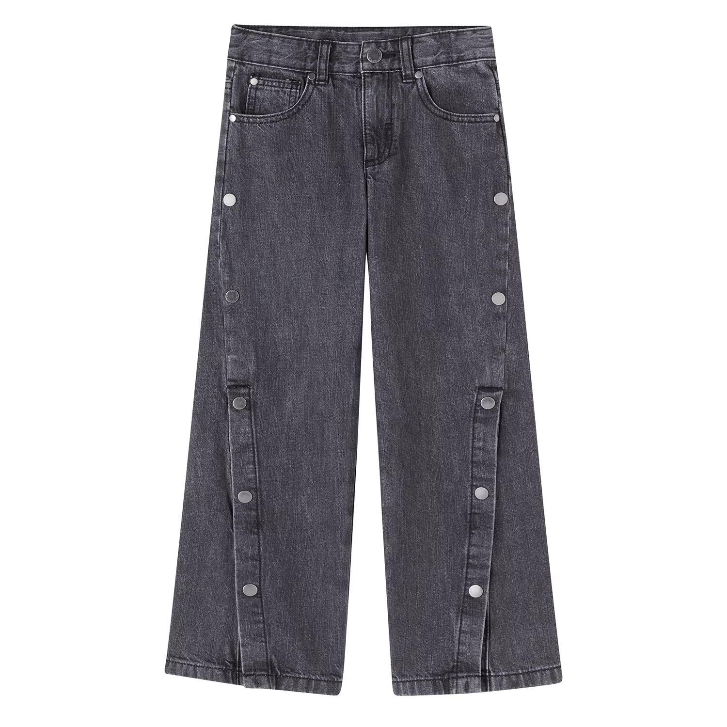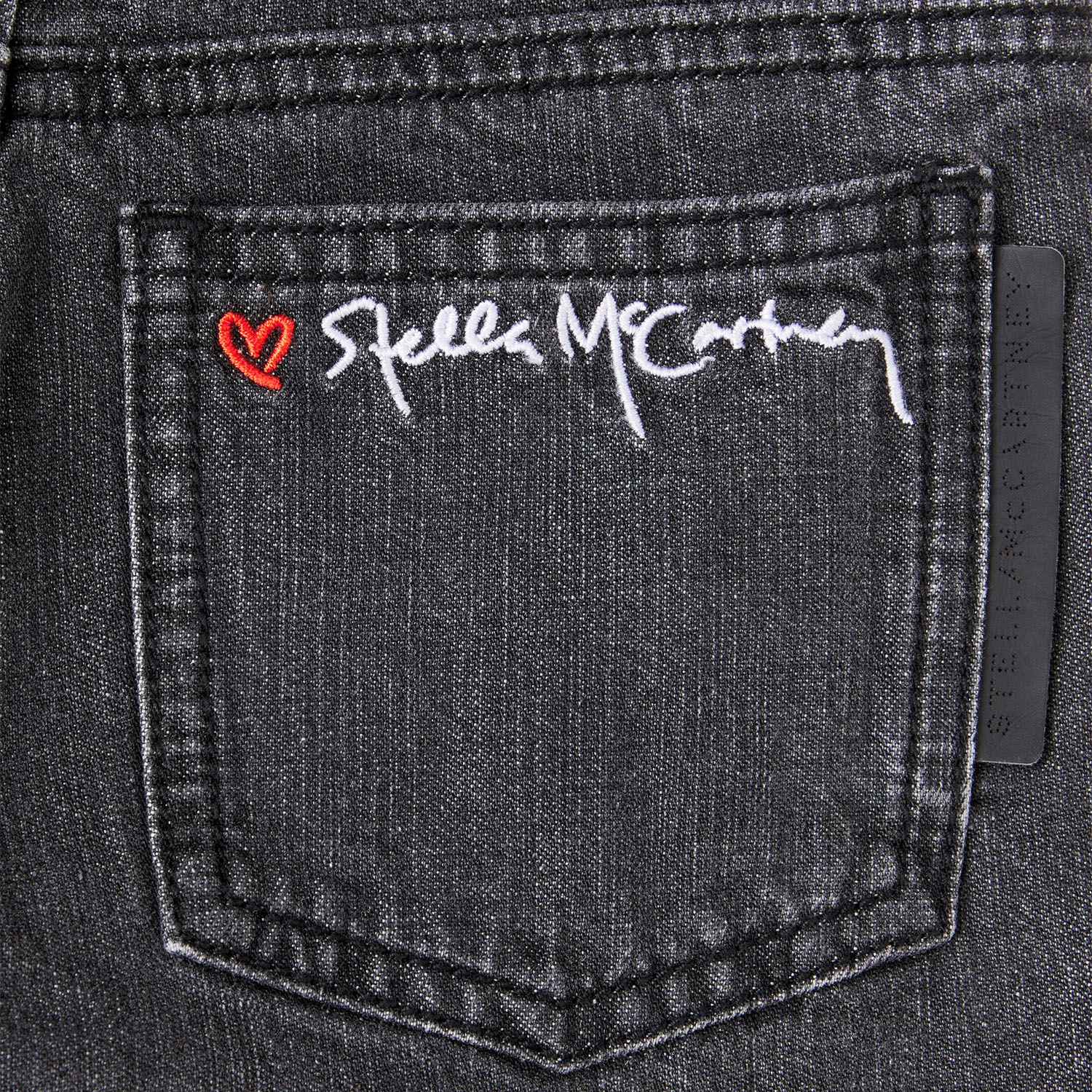Stella McCartney grey denim trousers with diagonal snap metallic button applications, elastic adjusters inside of the waist and an embroidered signature at the back.