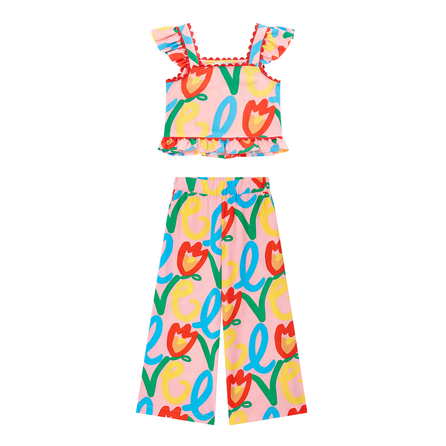 Stella McCartney colorful printed viscose set featuring a blouse with ruffle detailing and elasticated back. The trousers have wide leg and feature the same print.