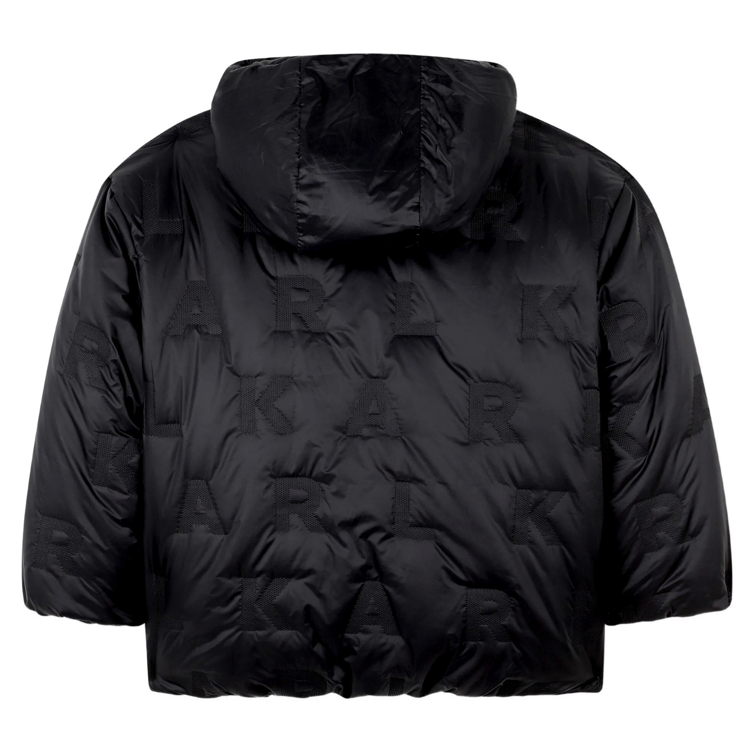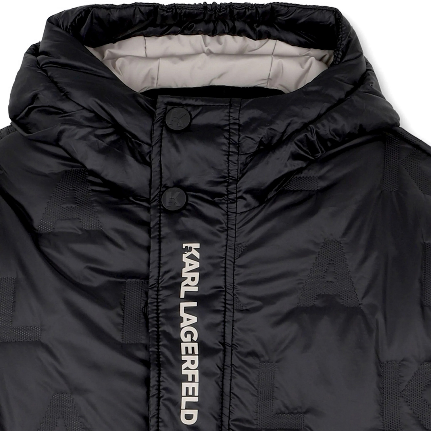 Karl Lagerfeld black padded jacket with tone-to-tone embossed logos, concealed fastening and an attached hood.