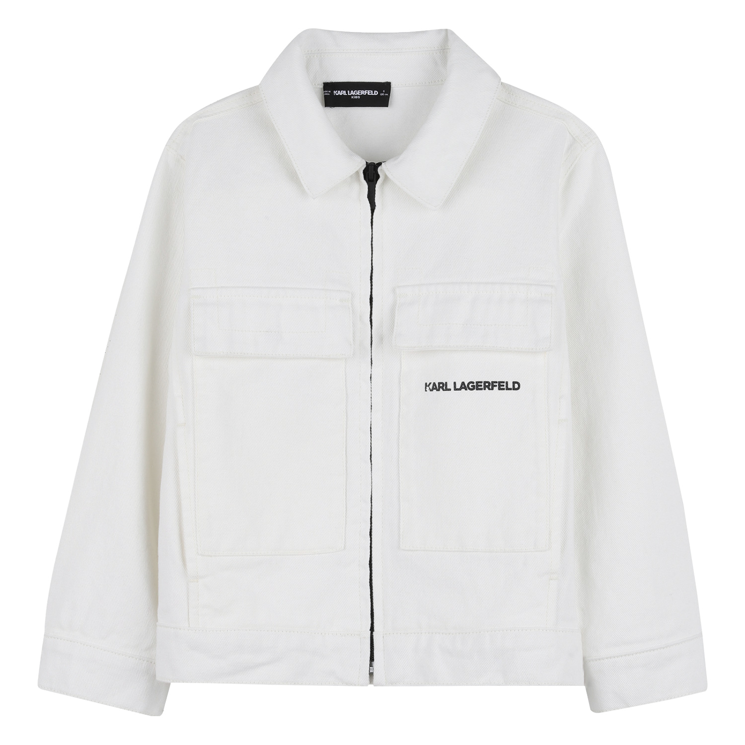 Karl Lagerfeld off-white cotton denim zip-up jacket, featuring two big square pockets and logo-monograms printed on the back.