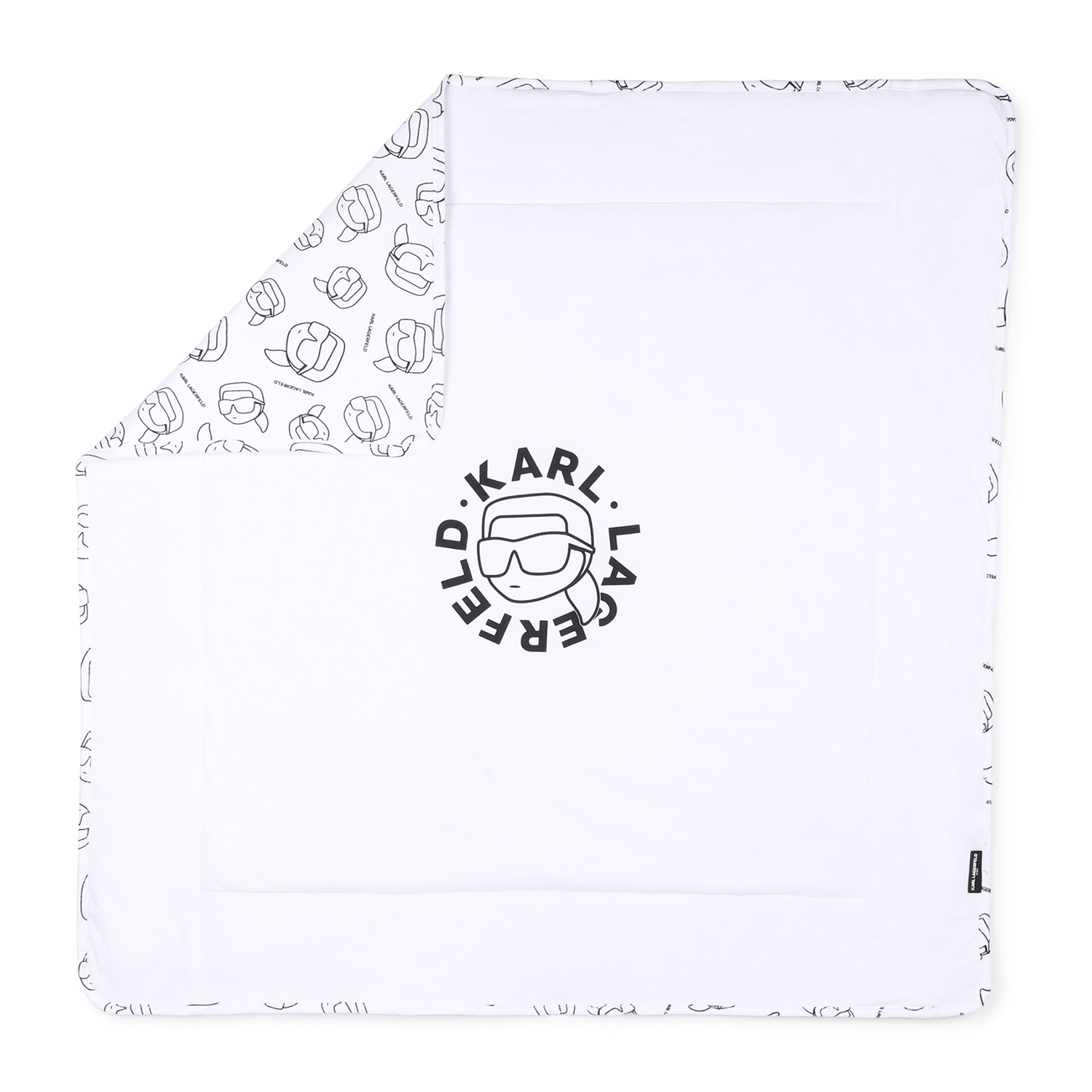 Karl Lagerfeld white organic cotton baby blanket featuring black figures printed.