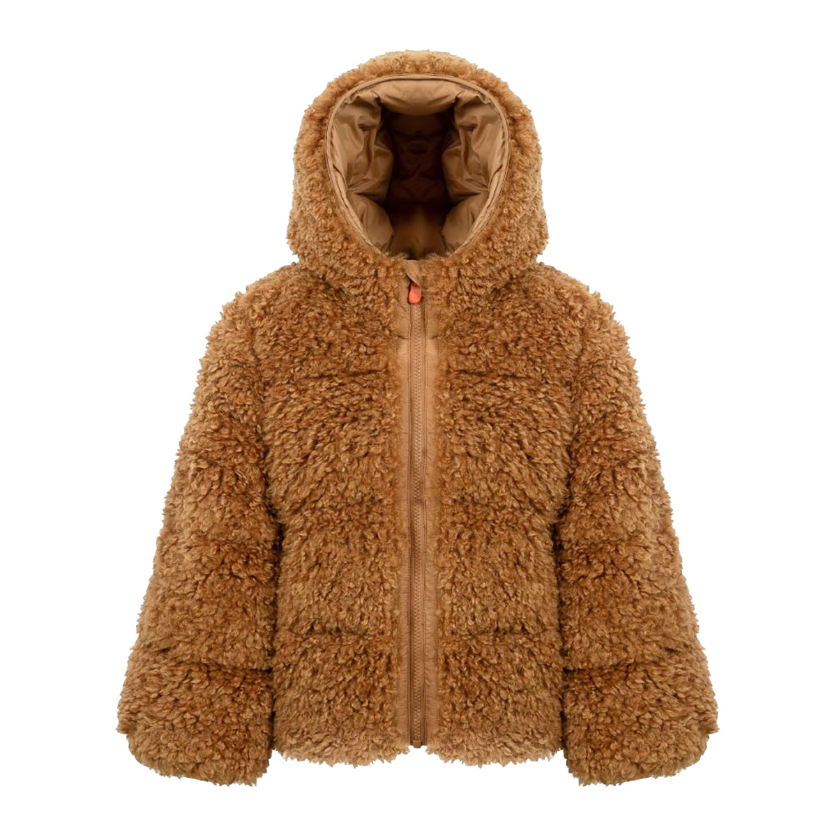 241€Save the Duck animal free, eco friendly fur jacket in toffee brown color. It features an attached hood, elasticated cuffs, inner padding and pockets. -