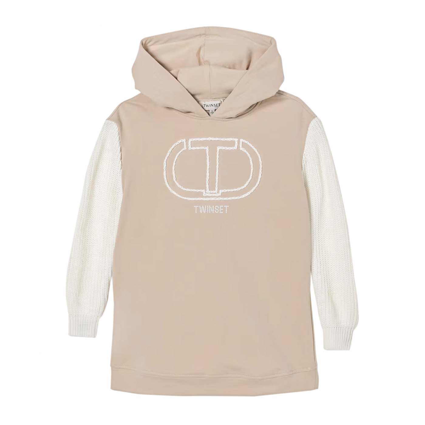 116€Twinset light beige cotton sweat dress with hood and knitted sleeves. It features front logo and rhinestone logo applications. -