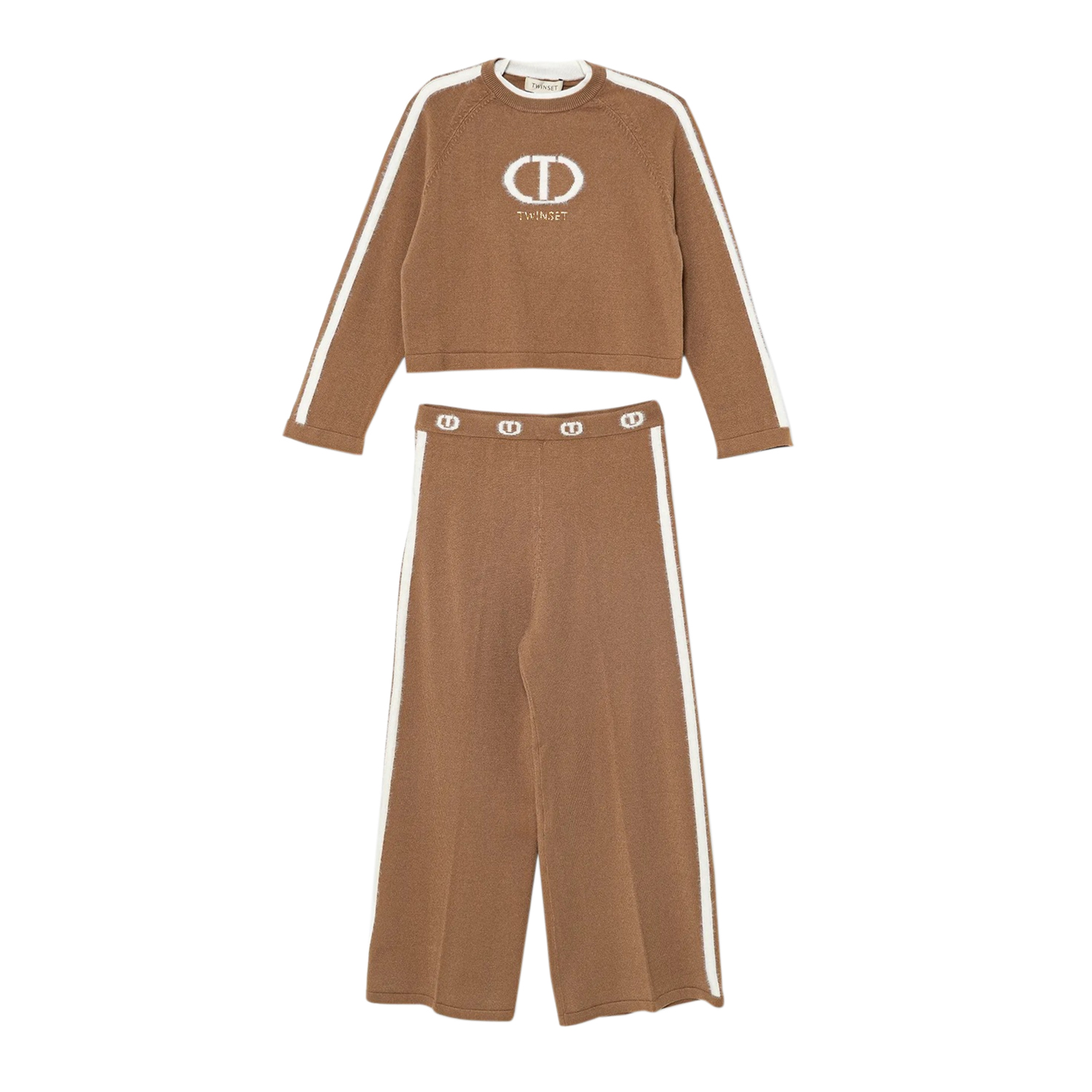 195€Twinset light beige cotton set, featuring a hooded sweatshirt with knitted sleeves and logo in front and matching trousers. -