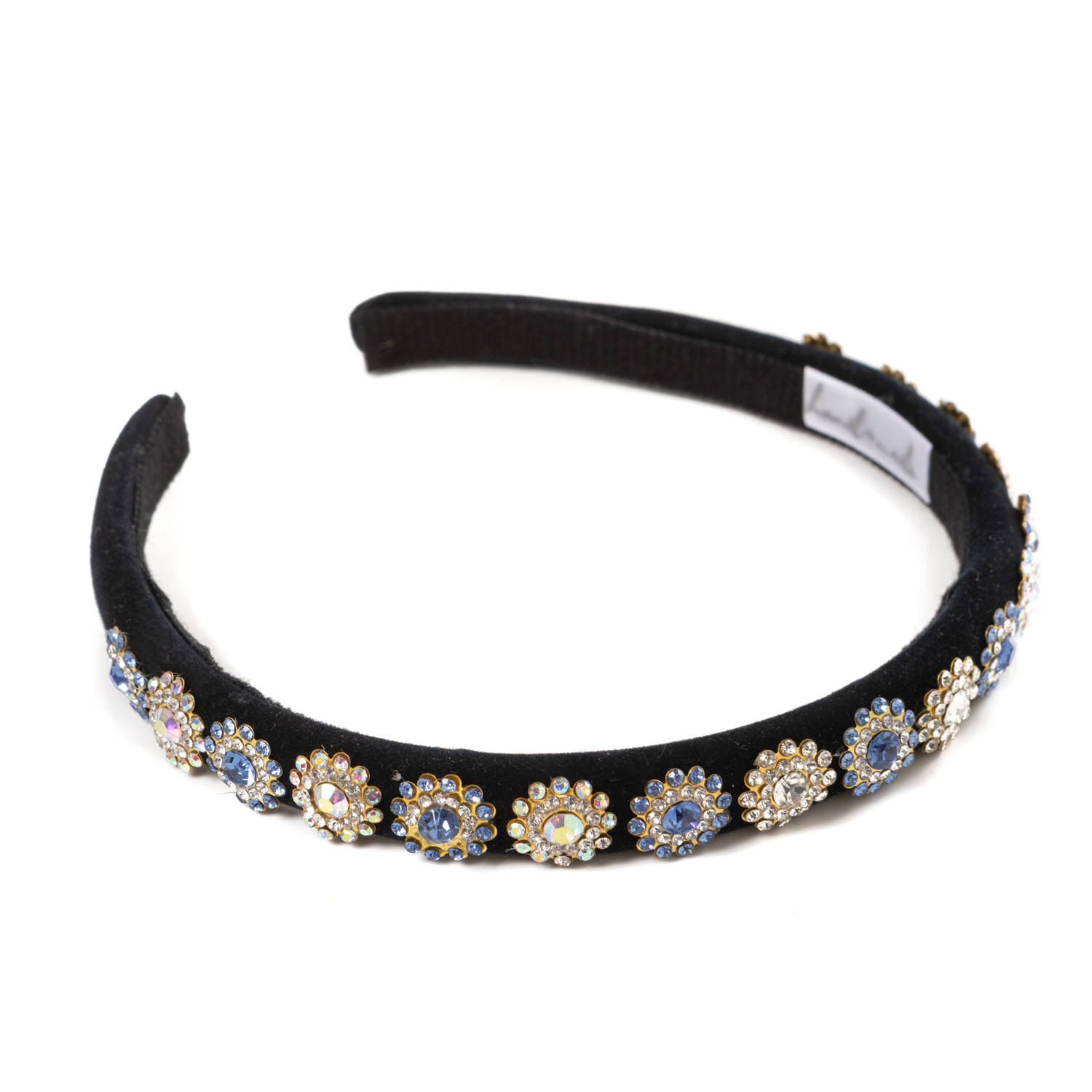 25€Handamde hairband featuring rhinestone daisy applications in blue and gold color. -