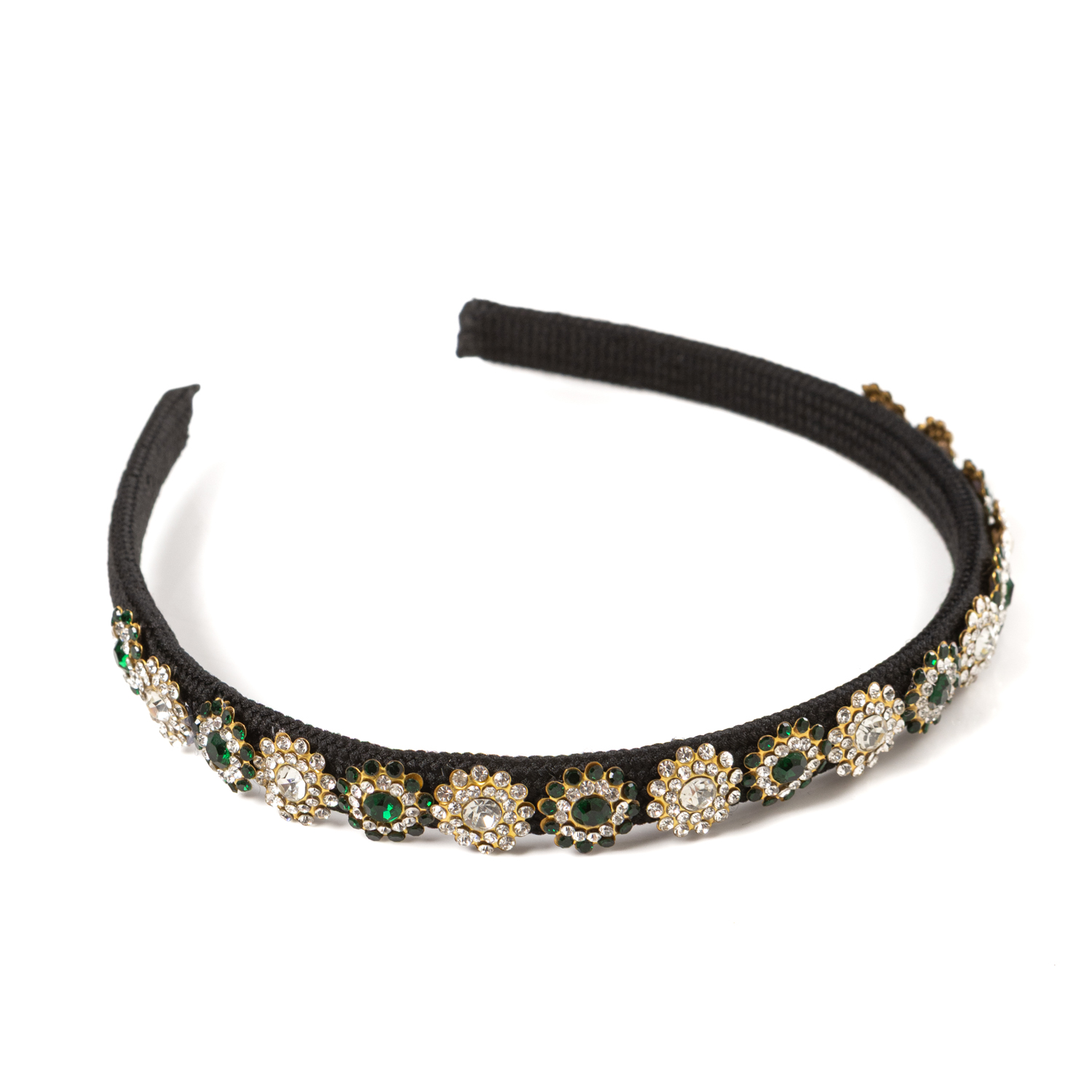 25€Handamde hairband featuring rhinestone daisy applications in green and gold color. -