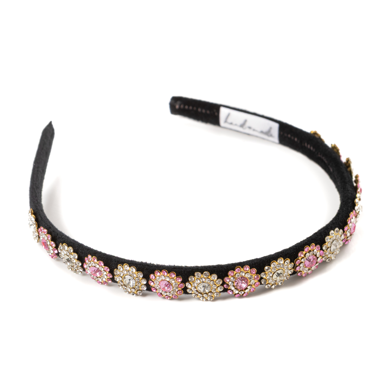 25€Handamde hairband featuring rhinestone daisy applications in pink and gold color. -