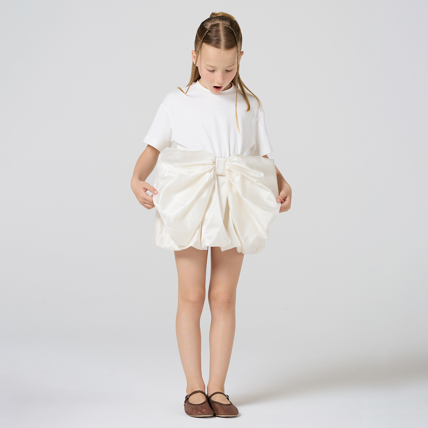 218€Pinko off-white balloon style dress with the upper part in soft and elastic jersey cotton and the lower part featuring a balloon style with bow… -