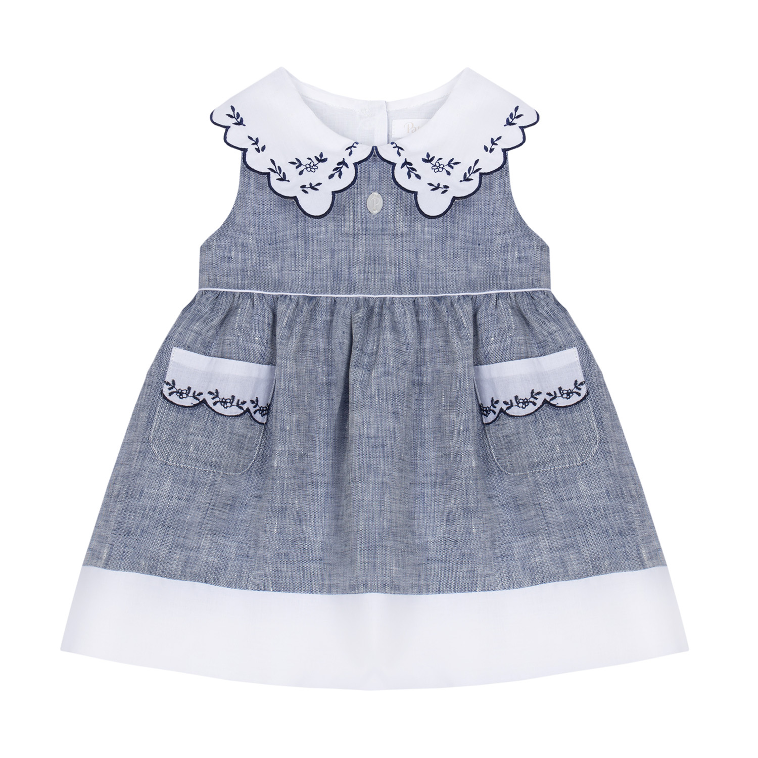81€Patachou blue-denim coloured dress made of soft organic cotton, featuring ruffle detailing with floral embroideries, soft lining inside and rear button fastening. -