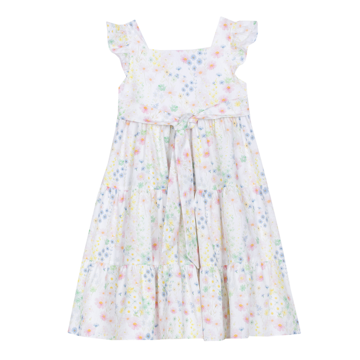 81€Patachou white organic cotton dress featuring colorful daisy flower prints, a bow-belt application, ruffle details on the sleeves and a soft lining inside. -