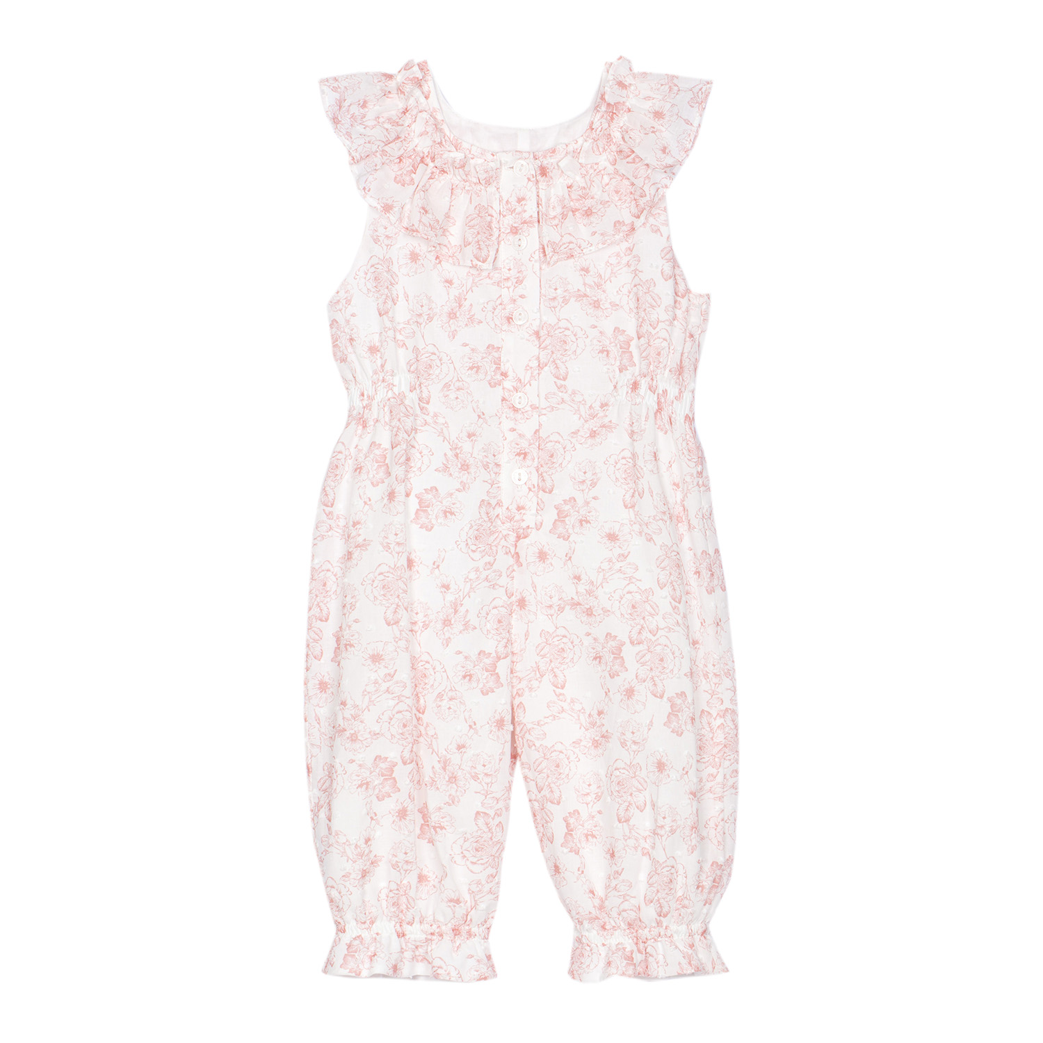 80€Patachou floral printed all-in-one/dungarees made of soft organic cotton. It features ruffle detailing and rear button fastening. -