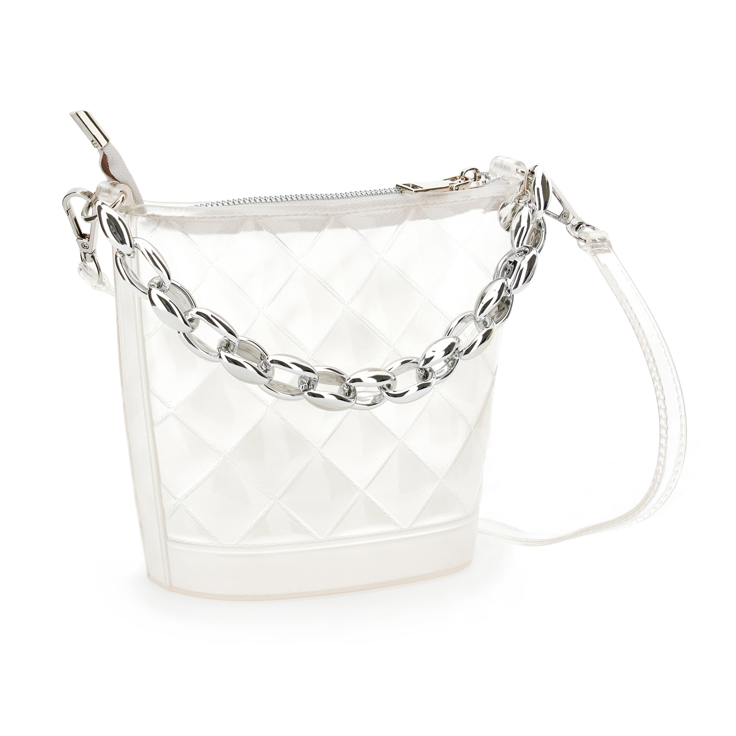 Monnalisa διάφανη/λευκή καπιτονέ τσάντα από ανακυκλωμένο υλικό PVC. Διαθέτει ασημί μεταλλικό φερμουάρ, λαβή σε στυλ αλυσίδας και tone-to-tone λουράκι ώμου.