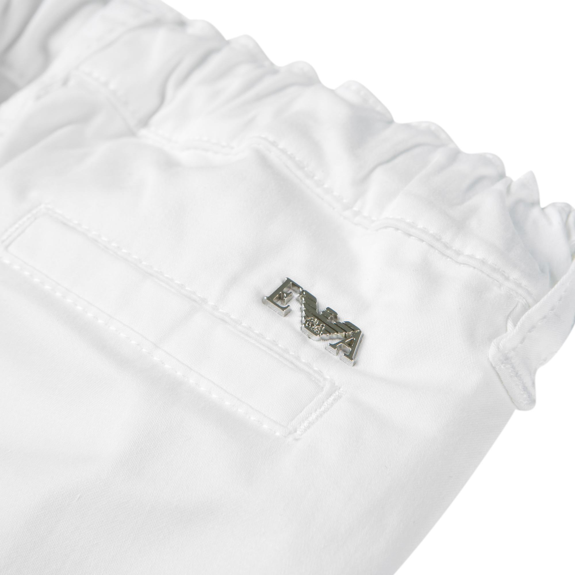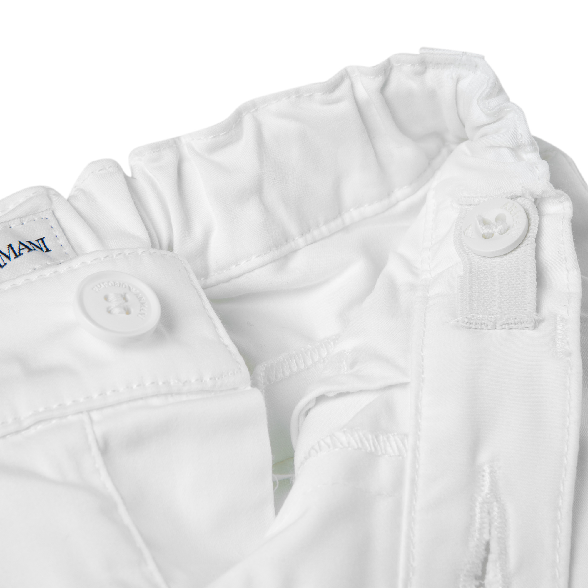 Emporio Armani white cotton trousers with elastic waist, plus elastic adjusters inside. It has diagonal pockets, a metallic logo at the back and classic button fastening.