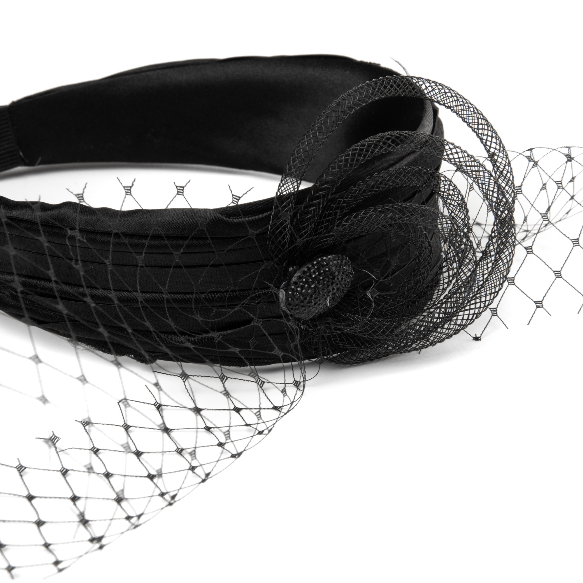 Handmade black satin hairband with pleated style, plus veil and bridal-fabric bow application.