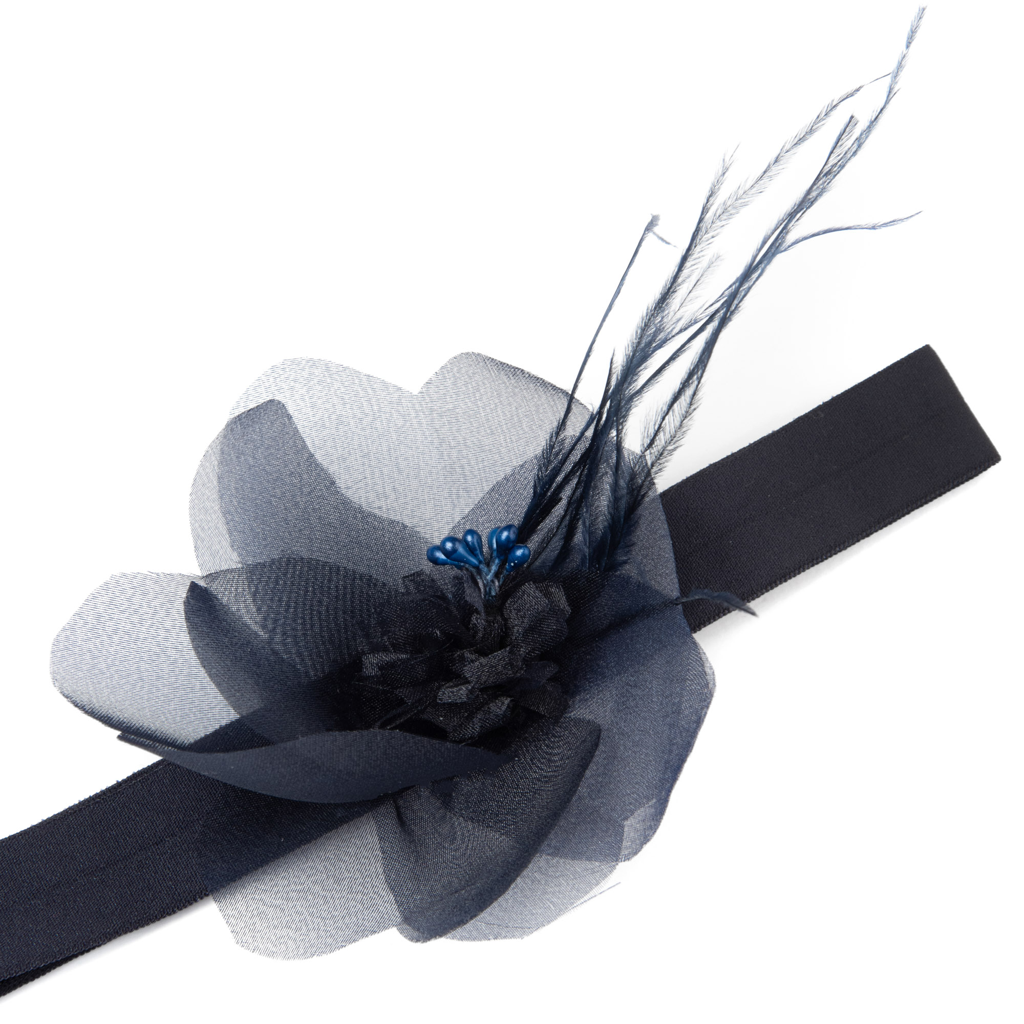 Handmade navy blue ribbon with organza flower application, plus feather details.