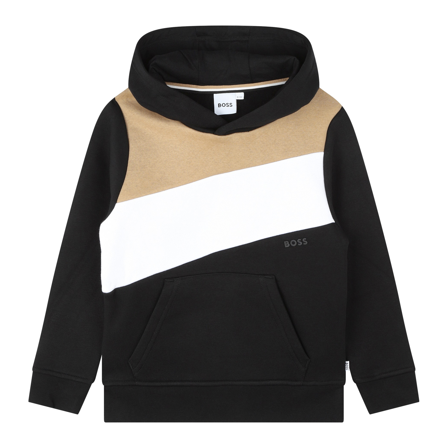 Hugo Boss black cotton hooded sweatshirt with two-tone color details, central pocket and a discreet logo.