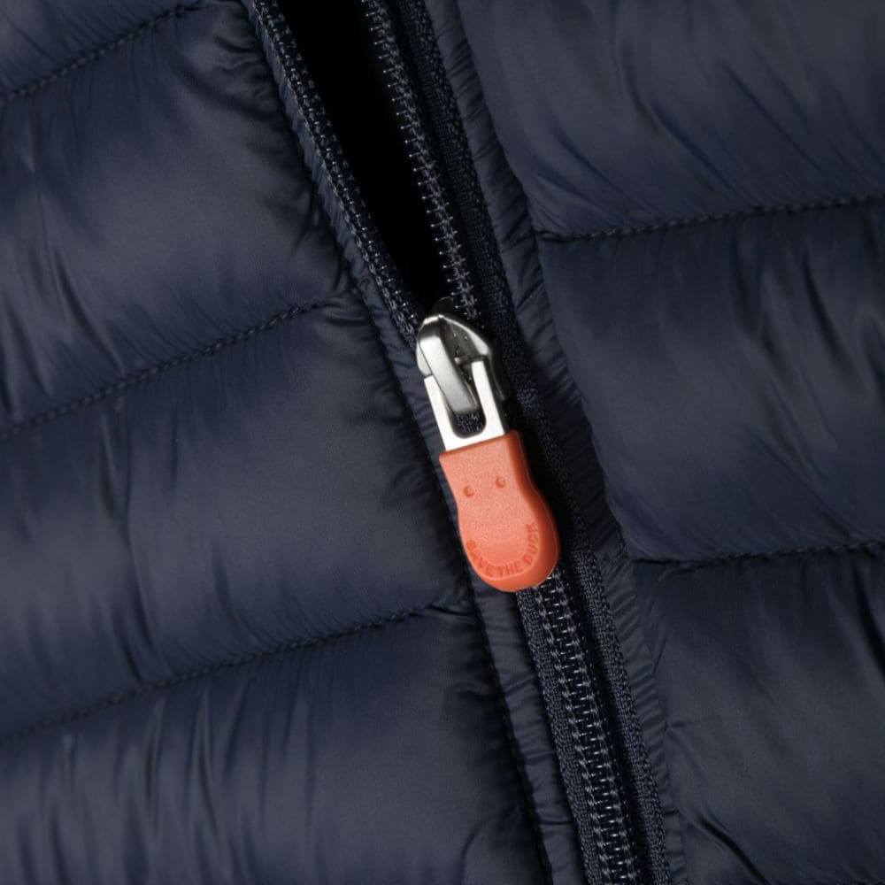 Save the Duck navy blue light jacket with eco-friendly/synthetic feather down padding. It features a tone-to-tone zip-up closure to the top of the adjusted hood and discreet pockets. It has elastic cuffs and a waist and it is made to be breathable, water repellent and to maintain the heat inside.