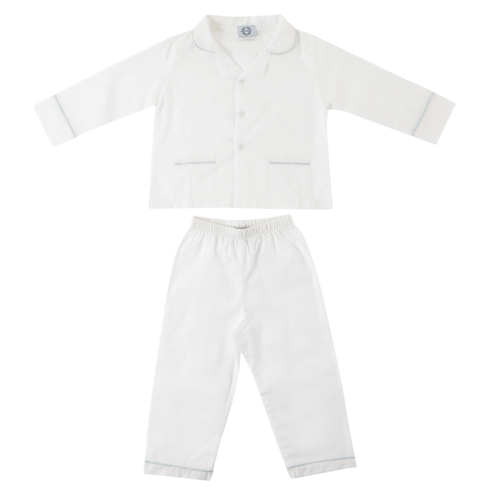 Maria Zeaki handmade white cotton pyjamas, with light blue details. It comes with a soft cotton baby toy. The final product may be different, due to be handmade.