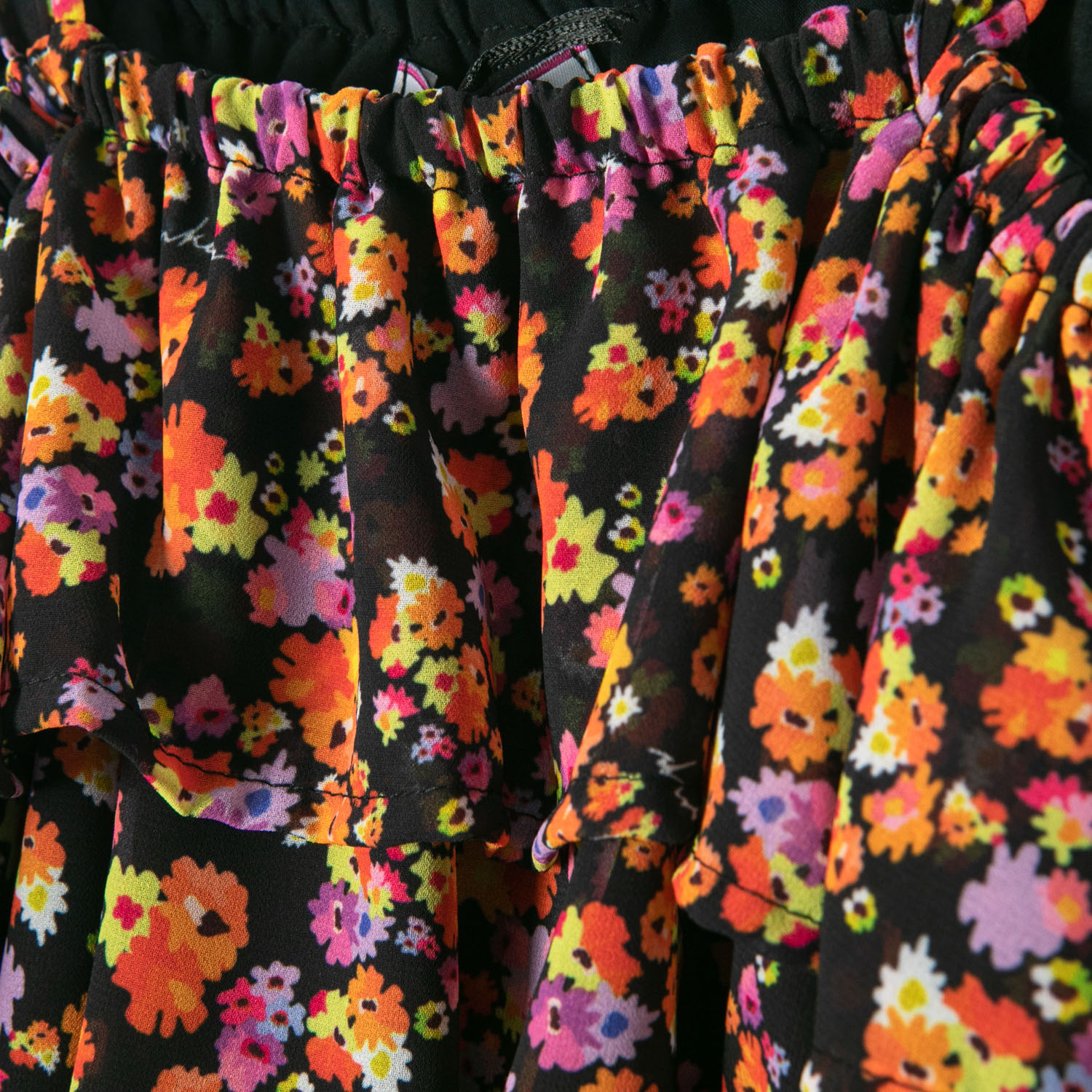 Pinko black-floral viscose set of a top and trousers. The top is elasticated with balloon sleeves and straps, while the trousers are very elastic, have A-line shape legs and logo elastic waistband.