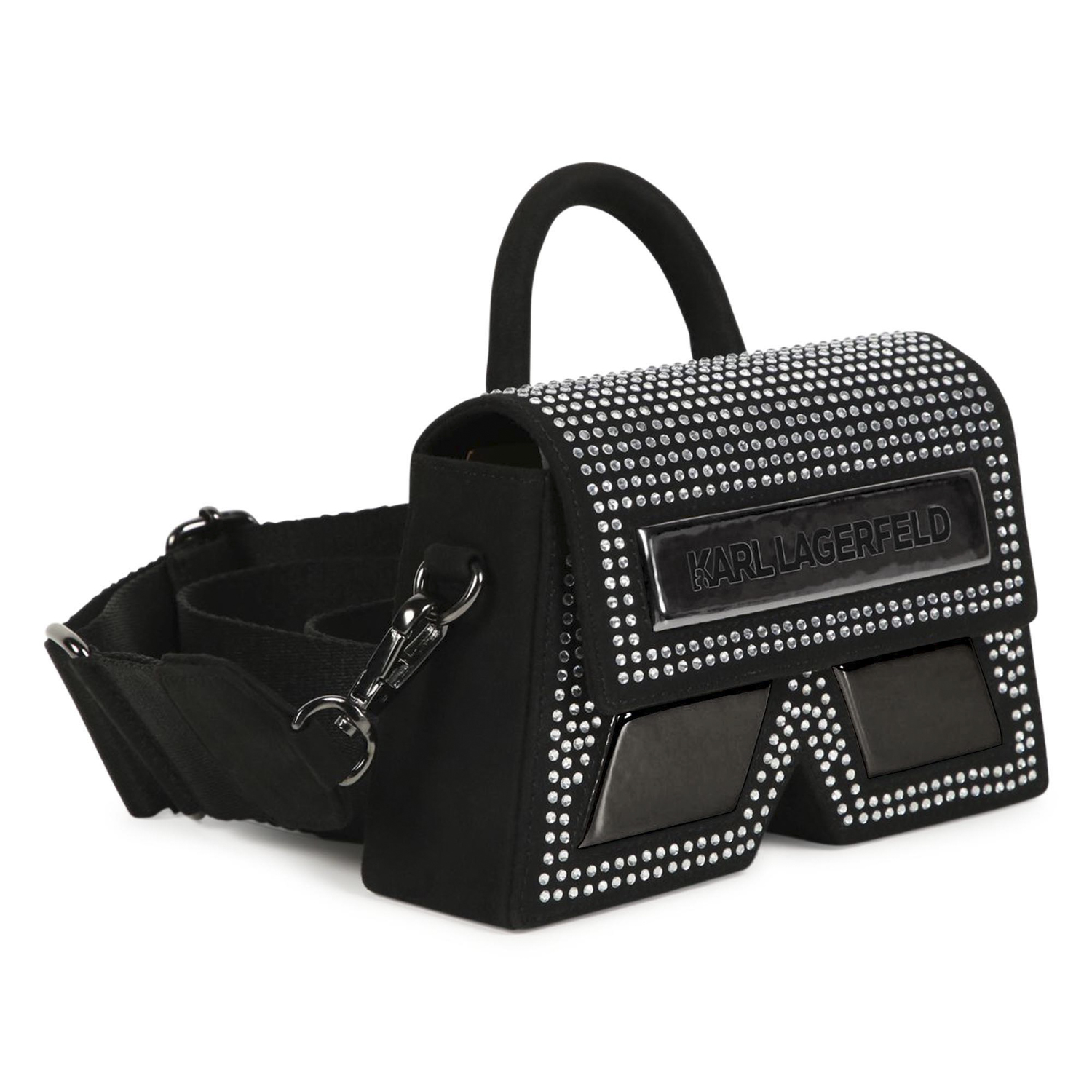 Karl Lagerfeld black eco-leather velour-felt shoulder-hand bag with IKONIK “K” monogram design, rhinestone applications and metallic coating details. It features an attached handle, a logo shoulder strap and snap magnetic button fastening.